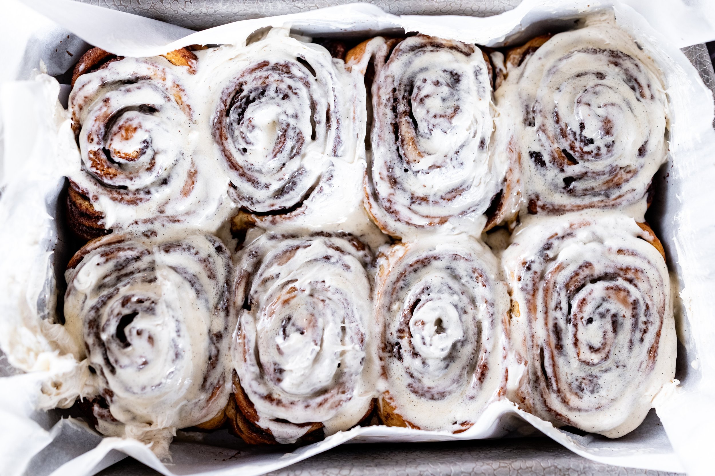 Our American-style cinnamon rolls, best enjoyed warm, have a tender center and are made with our heritage coco-brioche dough. In small batches, they are rolled by hand, baked until golden brown, & generously smothered in our signature buttercreams, glazes, & finishes. Our staple rolls are completely vegan, and each month we feature new seasonal flavors.